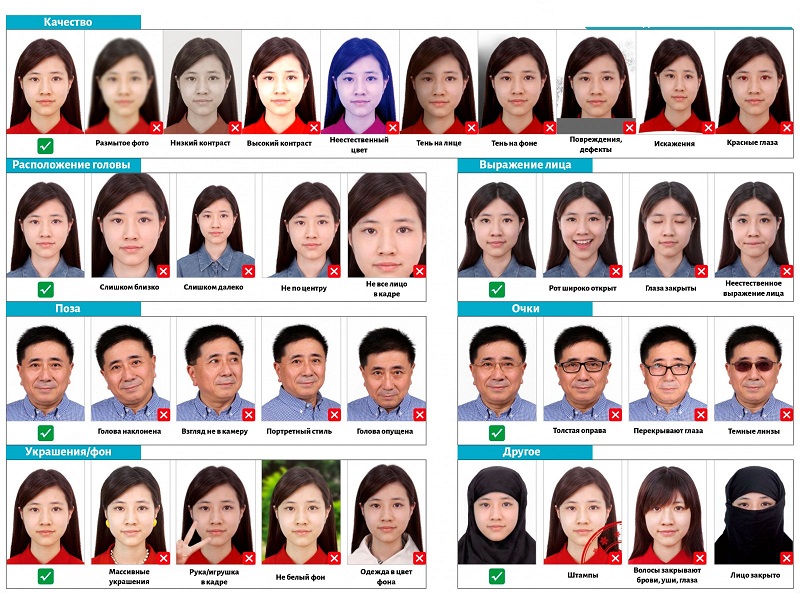 Лицо должно быть видно полностью, без теней или одежды, которые могли бы скрыть лицо. Не должно быть соски, шарфа, шапки или чего-либо еще, закрывающего лицо. Волосы не должны закрывать лицо.