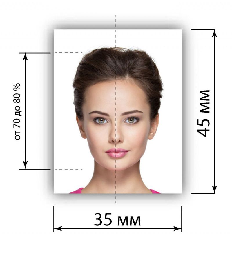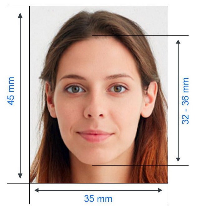 - Размер головы: не менее 70-80% от общего размера фотографии по высоте. То есть изображение головы в длину 32-36 мм., в ширину 18-25 мм. Из этого следует что, новый формат фотографий требует максимального приближения лица фотографируемого в кадре, плечи при этом практически не входят в кадр.