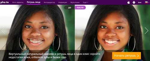 Makeup.pho.to подойдет для быстрой ретуши онлайн. Отсутствие ручных настроек ограничивает его использование – сервис некорректно распознает лица, взгляд на которых направлен вбок.