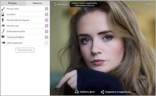 Сервис Makeup.pho.to http://makeup.pho.to/ru/ проводит коррекцию фотоснимков автоматически. Быстрая ретушь лица в фотошопе доступна онлайн на сайте и совершенно бесплатно. Вы загружаете фотографию с компьютера или из Фейсбука и запускаете процесс. Сервис распознает лицо, проводит ретушь губ, кожи, разглаживание морщин и удаление бликов, отбеливание зубов. Посмотрев на результат, можно отменить действие любого из этих инструментов. Для этого уберите соответствующую галочку в поле слева и нажмите «Применить». Чтобы сравнить изображение с исходным, кликните сверху «Оригинал». На вкладке «Эффекты» вы можете поменять стиль снимка, цветовое решение, заменить фон и освещение.