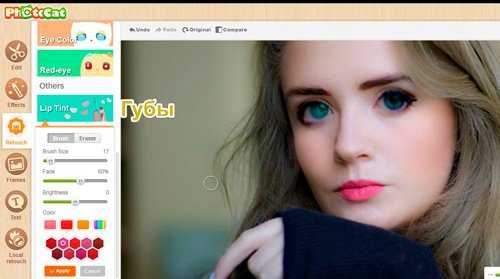 : измените цвет глаз на фотографии; Рекомендуем это делать маленькой щеткойПрофессиональная ретушь онлайн украсит портрет, удаляет веснушки, шрамы, морщины и различные дефекты лица и некачественной фотосъемки. Очистит кожу и отбелит зубы на фото, корректирует лицо и фигуру, уберет второй подбородок в онлайн режиме. Возможность нанесения макияжа или его замены. При этом индивидуальность и естественность фотографии никуда не пропадет. Также в обработку изображений включены цветокоррекция online, изменение резкости и устранение эффекта «красных глаз», нанесение текста на фотографию или его удаление, убрать лишние объекты.
