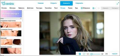 Проект Avantan https://avatan.ru/ – универсальное средство. Здесь доступны все базовые инструменты: обрезка, поворот, изменение экспозиции, резкости, цветов. Есть неплохие наборы фильтров и эффектов для преображения кадра. Инструмент «Ретушь» предназначен для улучшения и изменения внешнего вида. Все действия вы проводите вручную, с возможностью гибкой корректировки параметров.