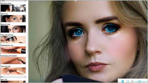 Далее работаем с глазами. Их можно увеличить, наложить тушь. Еще одно преимущество этого сервиса, что в большинстве случаев вам не придется ничего прорисовывать. Я просто кликал на тушь и затем щелкал по области глаз, при этом черные ресницы девушки становились еще темнее.