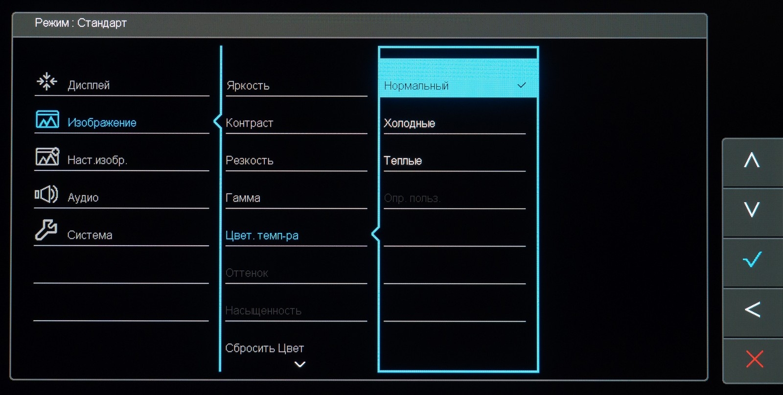 Вы можете сидеть на одном месте, но это не помешает TN+Film-монитору демонстрировать разную цветопередачу в разных частях экрана. Регулировкой наклона вы с лёгкостью сможете визуально изменить цветовую температуру экрана (на себя – холодный, от себя – тёплый оттенок), добиться моментального выцветания большинства оттенков, постеризации изображения и неразличимости крайних светлых полутонов.