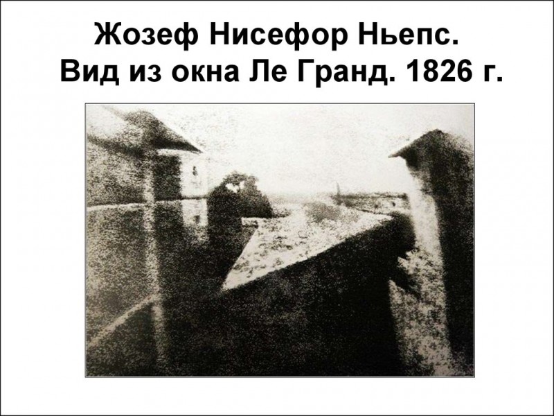 В 1826 году французский ученый Жозеф Нисефор Ньепс сделал эту фотографию под названием «Вид из окна в Ле-Гра » в загородном доме своей семьи. Ньепс сделал свою фотографию — вид на двор и хозяйственные постройки из окна верхнего этажа дома — выставив битумную пластину в камеру-обскуру на несколько часов на своем подоконнике.