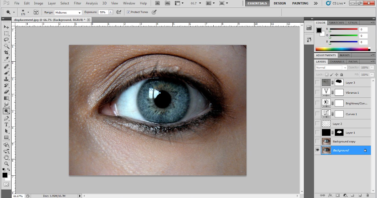 Стоит отметить, что этот конкретный метод будет лучше работать с изображениями, где глаза хорошо освещены (хороший блик очень полезен). Первым шагом является устранение покраснения и крошечных вен в глазах. Первый полезный инструмент для этого — исцеляющая кисть (Додсон использует диффузию на уровне 7 с режимом наложения осветления на пустом слое), затем он использует штамп клонирования (снова сделайте это на новом слое и текущем образце и ниже и используйте осветление). режим наложения и около 40% непрозрачности).