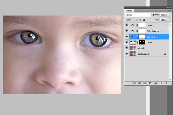 После первой части очистки Додсон предлагает добавить совсем немного шума (1-1,5% должно быть в порядке). Вы также можете использовать смесь if (это даст вам лишь небольшую разницу). Вы также можете добавить маску слоя Vibrance (инвертировать ее в черный цвет и закрасить белым только белую часть), это удалит красный цвет с белого, но вы также можете удалить некоторые нежелательные цвета с радужной оболочки.