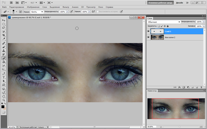 Выберите инструмент «Кисть» и начните аккуратно закрашивать глаза. Увеличьте изображение для получения более точных результатов.