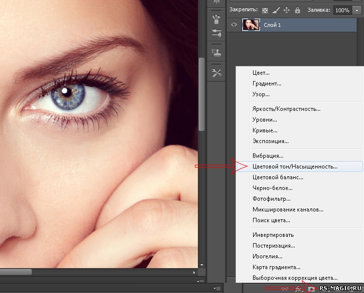 Метод №3: Изменение цвета глаз с помощью оттенка/насыщенности