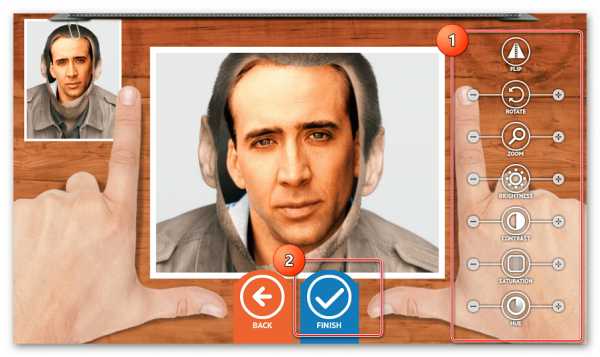 - Увеличиваем или уменьшаем фото, поворачиваем его, меняем яркость и контрастность с помощью правой панели. По завершении редактирования нажимаем на кнопку «Finish».