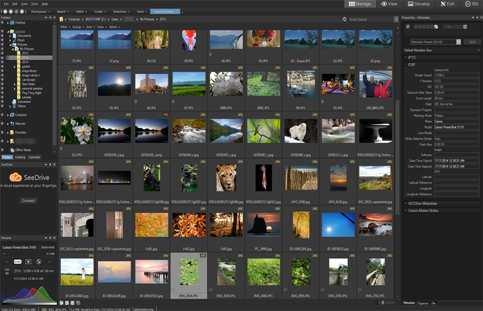 Популярный графический редактор ACDSee профессионального уровня, предназначенный для создания и редактирования графических файлов. Поддерживает работу с графическими файлами более чем 100 различных форматов, в том числе с картинками RAW-формата. Помимо возможностей редактирования отдельных фотографий, поддерживает пакетную обработку файлов — сортировка, редактирование, добавление мета-тегов и многое другое.