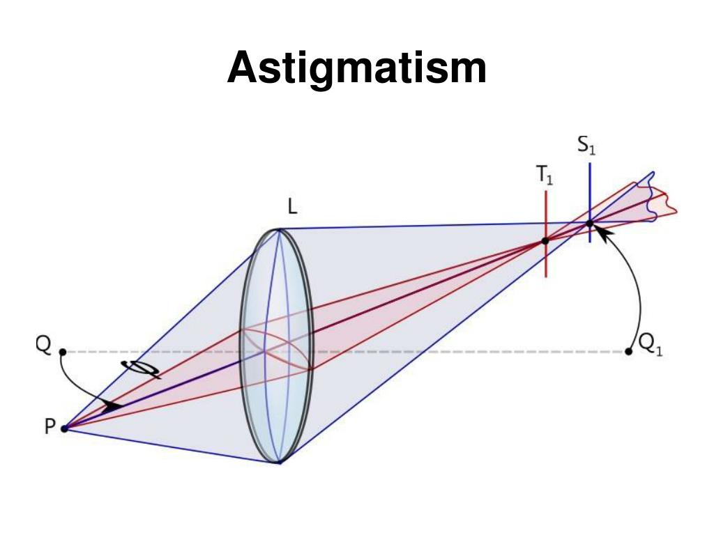 кома известна как астигматизм. Изображение точечного источника света не на оптической оси не является точкой. Его форма (горизонтальная линия, размытое пятно,