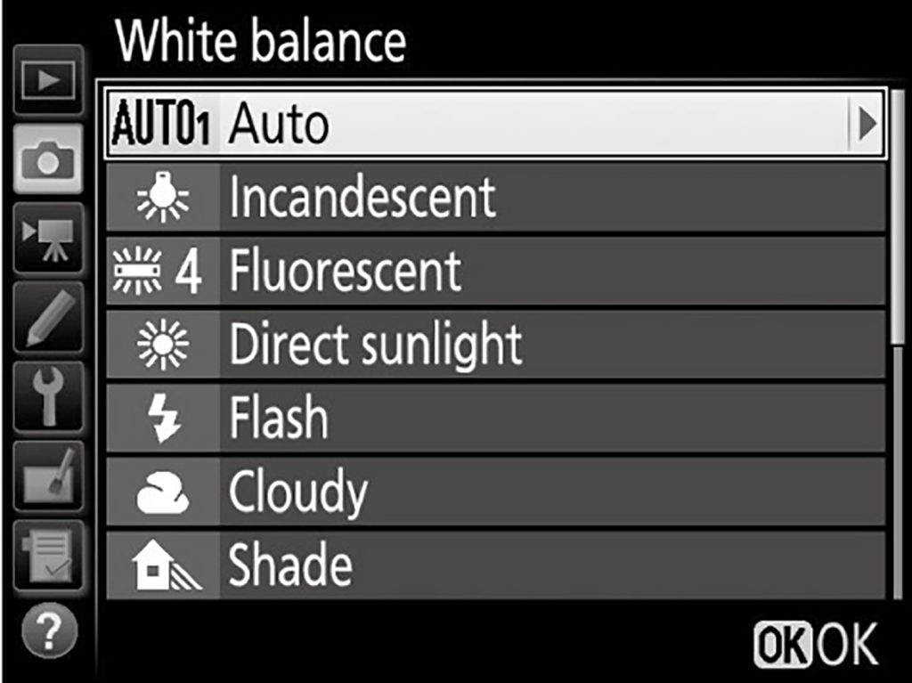 Для пользователей Nikon нажмите кнопку меню на задней панели рядом с ЖК-экраном и перейдите в «Меню съемки». Оттуда вы сможете выбрать «Баланс белого».