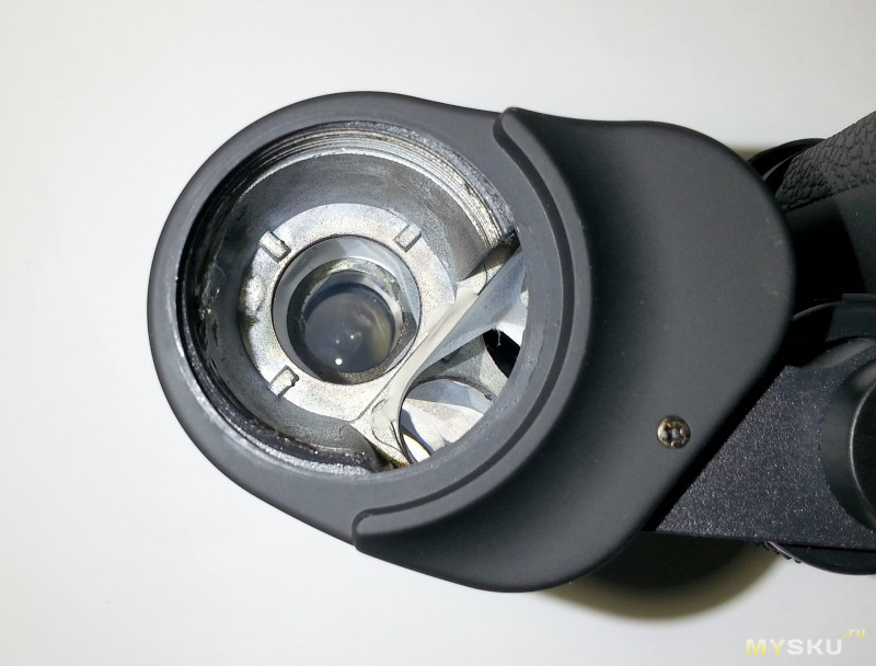 Приятным бонусом оказалось то, что основной корпус бинокля, где располагаются оборачивающие призмы, изготовлен из прочного алюминиевого сплава, а сами призмы надежно закреплены с помощью клеевого компаунда и стальной скобы: