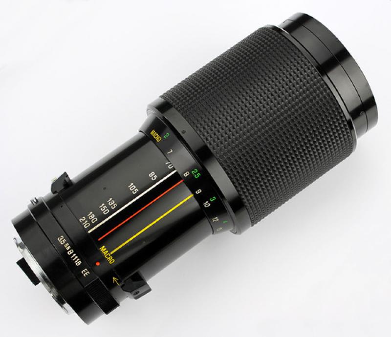 Объектив заметно страдает аберрациями на открытых диафрагмах, виньетированием (особенно 210 мм), может поймать несколько бликов.