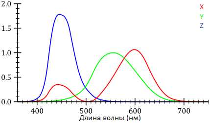 При описании цвета значения X,Y,Z называют стандартными основными возбуждениями, а полученные на их основе координаты – стандартными цветовыми координатами. Стандартные кривые сложения X(λ),Y(λ),Z(λ) (см. Рис.) описывают чувствительность среднестатистического наблюдателя к стандартным возбуждениям: