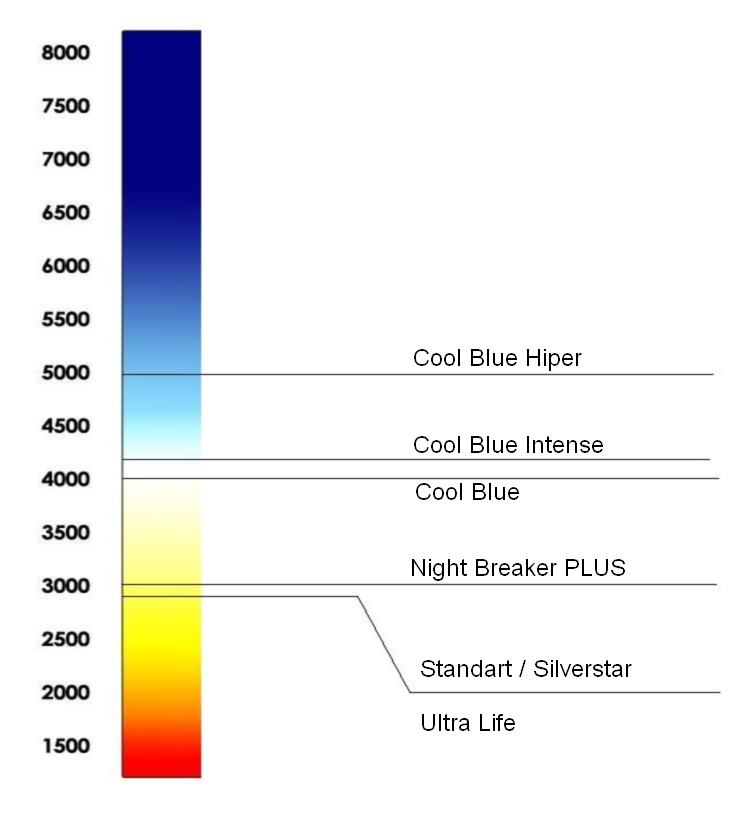 Но, существуют и такие лампы ксенона, которые обеспечивают больше не качество света для машины, а ее тюнинг, например 7000K, 8000K, 10000K и выше. Зависимость температуры цвета и яркости