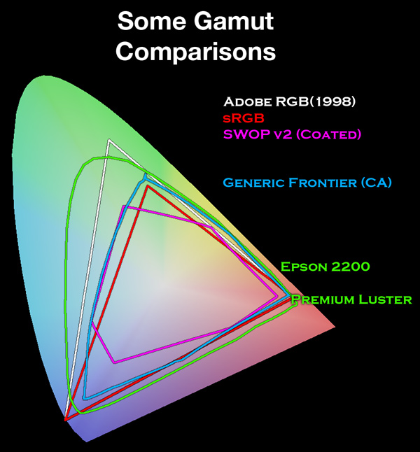 Координаты называются хроматическими. И, так как одна координата (в данном случае z) может быть получена по известным x и y, она не используется. Эта диаграмма совмещена с областями, которые представляют возможные диапазоны устройств различных стандартов и печатающих устройств (как все неоднозначно в этом мире). Сравнивая области, можно сделать вывод, что современная техника обеспечивает воспроизведение лишь примерно половины видимого спектра.
