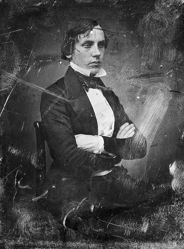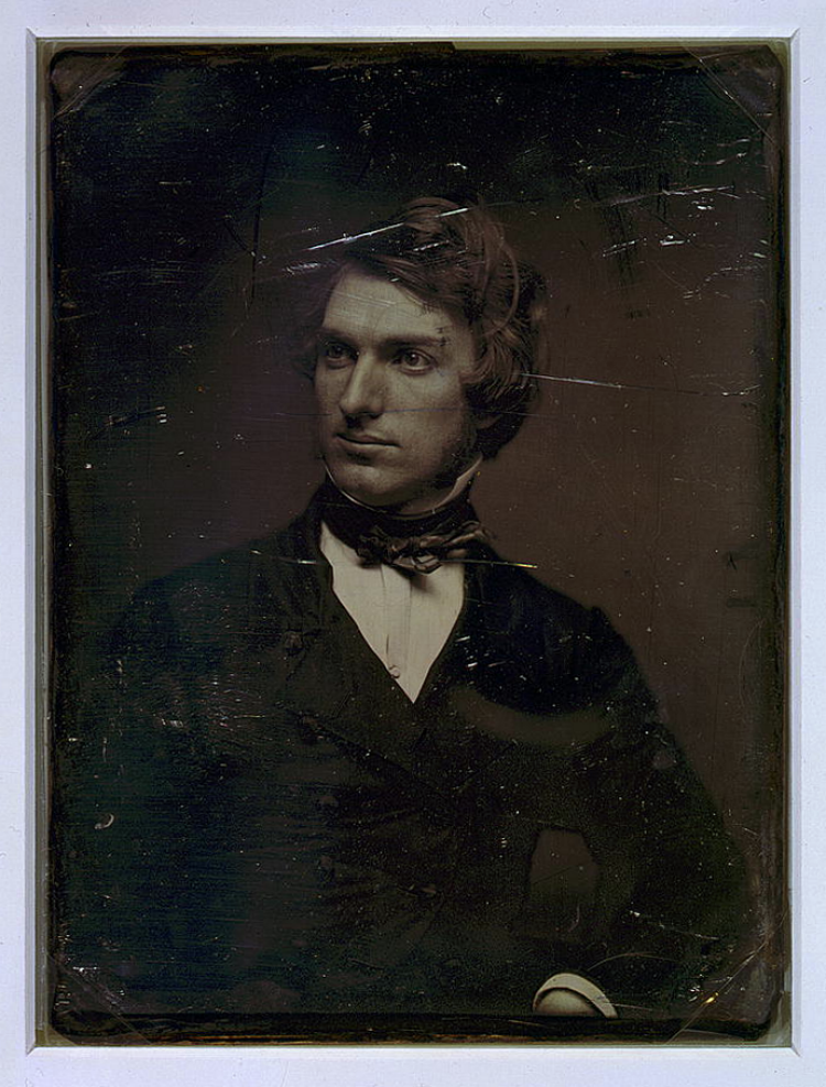 Доктор Джон Уильям Дрейпер, долгое время считавшийся первым человеком, сфотографировавшим человеческое лицо, сидящего с ручкой в руке во время своего эксперимента с растениями, в Нью-Йоркском университете осенью 1839 года. Дагерротип Сэмюэля Морса, 1839 год.