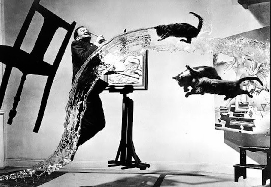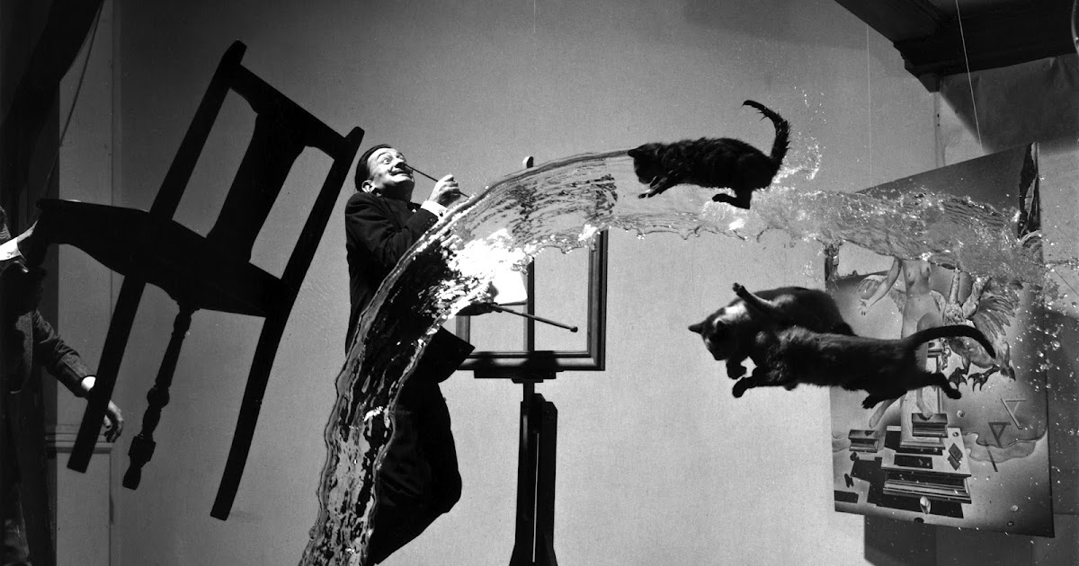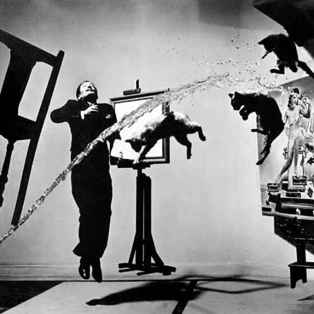 фотография взята с http://bigpicture.ruПомощник поднимает стул, все занимают свои места. Начинается счет. «Три!» — один ассистент выплескивает ведро воды, другие — бросают кошек. «Четыре!» — Дали подпрыгивает, Халсман снимает. Потом фотограф отправляется в темную комнату, а пока он проявляет и оценивает результат, ассистенты убирают разлитую воду, ловят и успокаивают несчастных кошек. Шесть часов съемок. 28 выплеснутых ведер воды, 28 раз брошенные кошки. И никакого Photoshop’а. Халсман писал потом, что к концу съемок лучше всех чувствовали себя кошки, а сам он и грязные, мокрые ассистенты буквально валились с ног.
