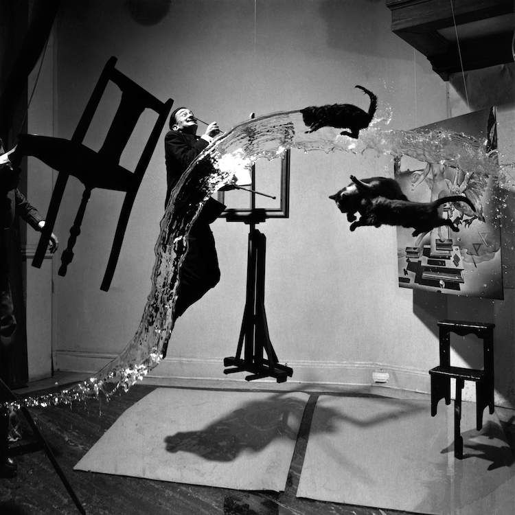 Физики также выдвинули предположение, что вся материя свободно висит в постоянном состоянии временной остановки. Узнав об этом, Халсман решил «подвесить в воздухе» своего друга — великого Сальвадора Дали, вместе с мебелью, мольбертом и картинами. С этим снимком до сих пор связано много легенд. Говорят, изначально фотограф решил вместо воды в кадре лить молоко, но идея была отвергнута из-за опасения навлечь на себя гнев публики, которая в голодные послевоенное годы могла счесть перевод продукта, даже в целях сотворения шедевра, кощунством. То ли дело кошки?! Следующий замысел мастера был не менее ужасен, — подброшенного кота планировалось взрывать, а на камеру ловить момент «разрыва» животного на мелкие кусочки.
