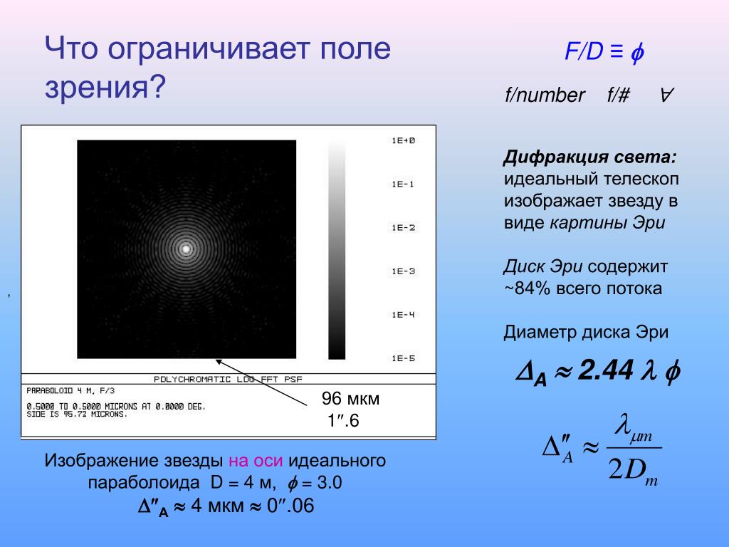 Диаграммы Эйри и критерии разрешения (трехмерная версия) — Учебное пособие по Java для освещения образца используется монохроматический свет). Для хорошо скорректированного объектива с равномерной круглой апертурой две соседние точки разрешаются только тогда, когда центры их диаграмм Эйри разнесены на минимальное расстояние ( D ), равный радиусу ( r ) центрального диска в узоре Эйри. В этом учебном пособии показано, как размеры диска Эйри на пределе оптического разрешения изменяются в зависимости от числовой апертуры объектива и длины волны освещения, а также как эти изменения влияют на разрешение (