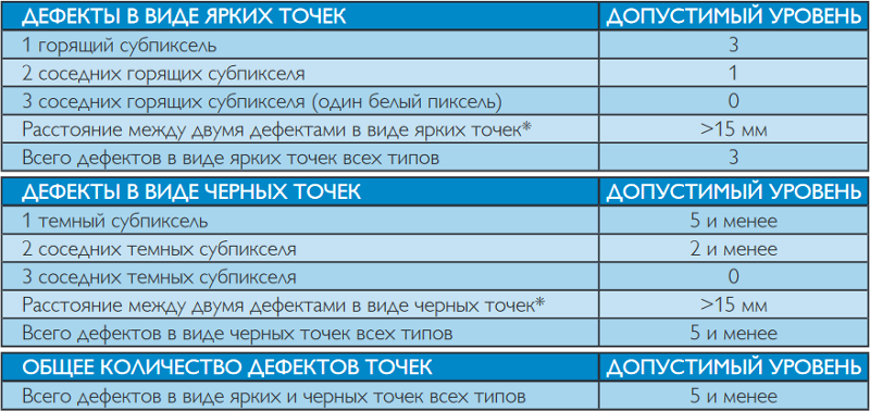 - Максимально допустимое количество точек с двумя соединенными битыми пикселями: 2