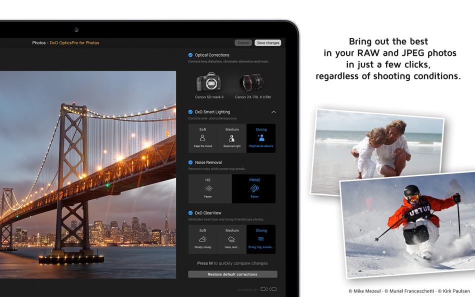 Максимально улучшите качество файлов RAW перед их редактированием в Adobe Photoshop®, Adobe Lightroom Classic® или других программах для редактирования RAW благодаря эксклюзивной функции демозаики DxO , шумоподавление и технология коррекции линз