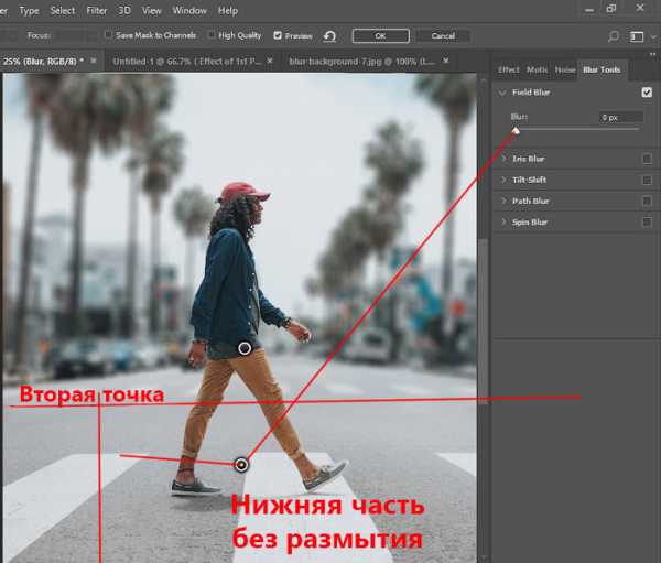 Еще раз кликаем по документу, чтобы добавить вторую точку. Этой точкой мы указываем место, после которого размытие исчезает. Программа размоет участок только между этими двумя точками. Если размыть нижнюю часть фона, то результат получится не очень красивый. Поэтому устанавливаем размытие второй точки на 0 пикселей.