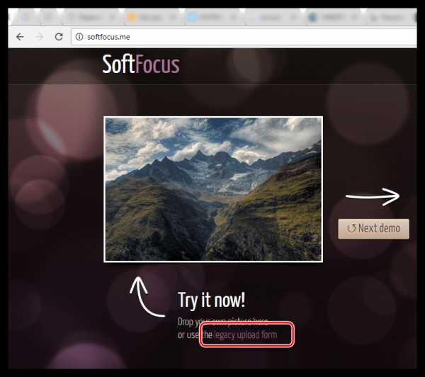 - Пройдите на страницу онлайн-сервиса SoftFocus по этой ссылке. Чтобы приступить к работе, кликните по ссылке «Legacy upload form».