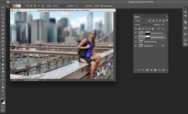 Размытие на фотографии уже выглядит довольно естественно, остался один небольшой штрих — размыть передний план. Кликаем по слою Background Copy, на котором самое слабое размытие, добавляем к нему маску и накладываем градиент.