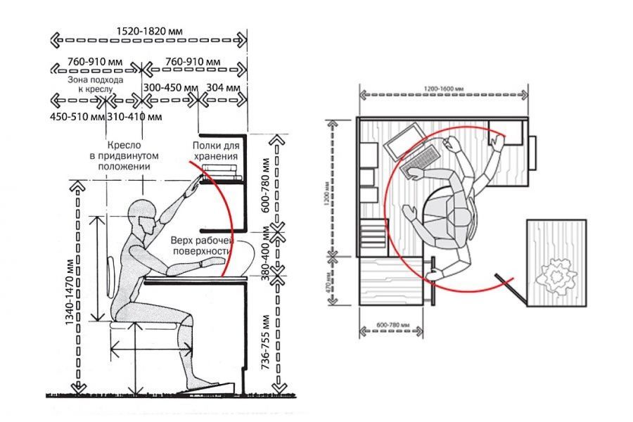 При обустройстве зоны данного назначения следует учитывать качество мебели и ее расположение. Эргономика рабочего пространства подразумевает наличие специального кресла, в котором человеку удобно работать за компьютером или другими девайсами. Например, это может быть модель с пятилучевыми ножками на роликах. Ноги должны свободно касаться пола так, чтобы стопы располагались перпендикулярно к икроножным мышцам. Спинку кресла рекомендуется откинуть назад, чтобы не было давления на внутренние органы. Расположение освещения также имеет значение: его следует направить так, чтобы тень от тела человека не ложилась на стол.