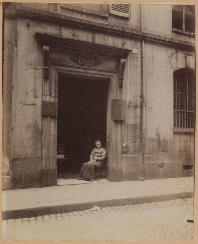 и магазины с витринами. Он фотографировал лестничные клетки и архитектурные детали фасадов, фотографировал интерьеры квартир.Его интерес распространялся и на окрестности Парижа. Помимо архитектуры и городской среды, он также фотографировал уличных торговцев, мелких торговцев, сборщиков тряпья и проституток, а также ярмарки и народные увеселения в различных районах. Окраины и периферийные районы, в которых искали убежища бедняки и бездомные, также давали ему живописные сюжеты.