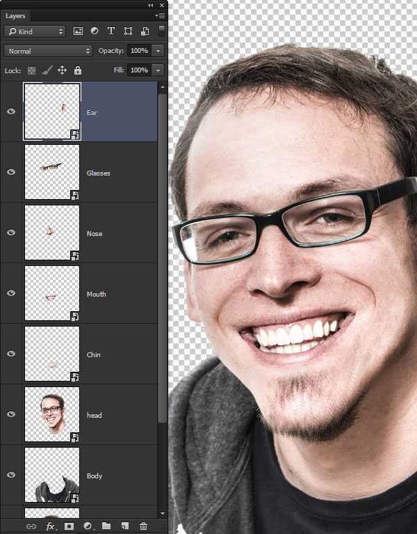 Итак, отдельные черты лица расположены на отдельных слоях, теперь, мы можем приступить к их трансформации, создав карикатуру. Универсальность Смарт-объектов поможет работать с различной комбинацией размеров, чтобы получить весёлый эффект.