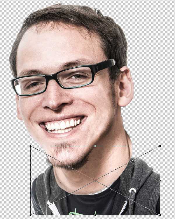 Традиционная техника карикатуры состоит в создании слишком большой головы по сравнению с туловищем. Для этого, нам необходимо значительно уменьшить изображение туловища, поэтому идём Редактирование – Свободная трансформация (Edit > Free Transform).
