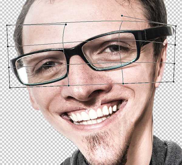 Очки требуют более аккуратной работы, чем просто масштабирование, которое мы применяли к другим элементам изображения. Инструмент Деформация (Warp tool) поможет совместить растянутую оправу на лице, для этого идём Редактирование – Трансформация – Деформация (Edit > Transform > Warp).