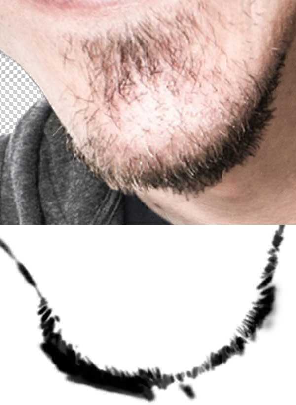 Самая сложная часть работы – это обработка подбородка на слой-маске слоя, т.к. приходится обрабатывать волоски в области бородки на подбородке. Просто используйте кисть диаметром поменьше, а также проявите терпение. На скриншоте ниже, вы можете увидеть обработку на слой-маске слоя с подбородком и результат совмещения.