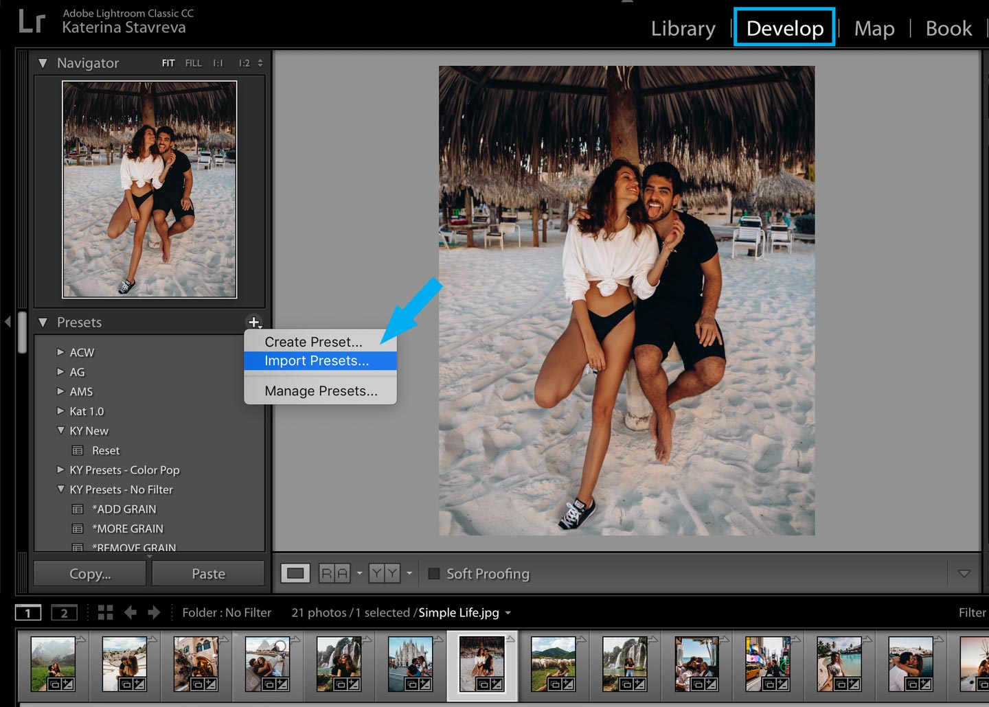Способ использования файлов XMP в Lightroom очень похож на Photoshop. В Lightroom откройте фотографию, которую хотите отредактировать, и перейдите на вкладку «Разработка». Оказавшись там, вы найдете вкладку Presets на левой боковой панели. Щелкните знак + справа и щелкните Import Presets.