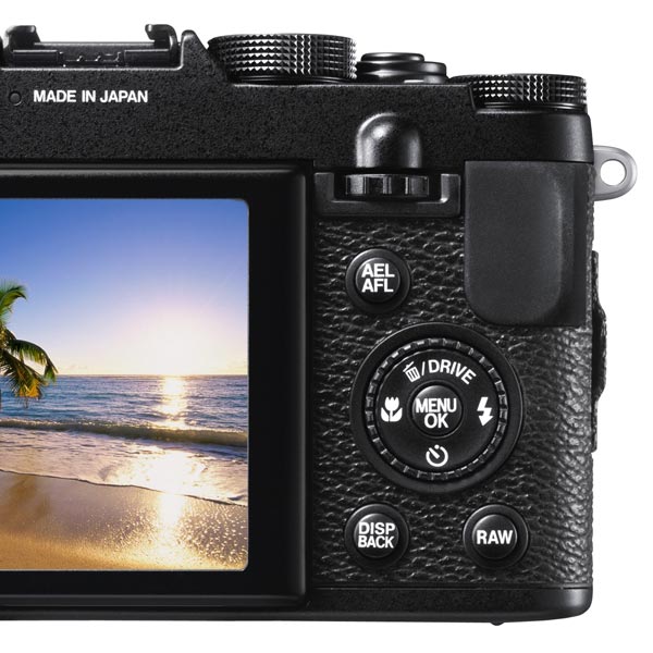 На задней стороне Fujifilm FinePix X10 находятся: рычаг изъятия вспышки, регулятор диоптрийной коррекции, видоискатель, программные кнопки, служебный индикатор, дисплей, колесико настройки выдержки и диафрагмы, а также диск управления. Включается аппарат поворотом объектива по часовой стрелке.