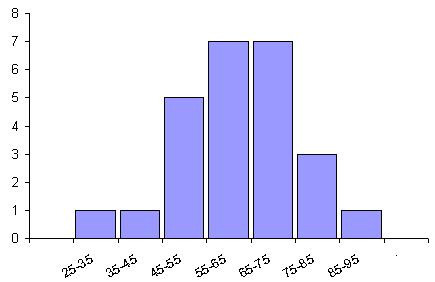7. Строится гистограмма – на оси абсцисс (горизонтальной оси) отмечаются интервалы, а на оси ординат (вертикальной оси) отмечается частота попаданий результатов измерений в каждый интервал. Интервалы можно устанавливать в натуральных единицах (если позволяет масштаб), т.е. в тех единицах, в которых проводились измерения, либо каждому интервалу можно присвоить порядковый номер и отмечать на оси абсцисс номера интервалов. В результате получается столбчатая диаграмма, представленная на рисунке ниже.