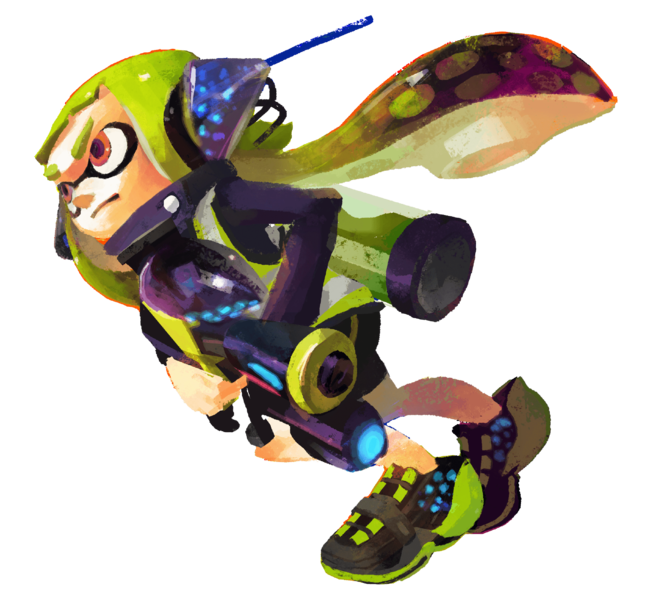 The Inkling lands with a splash of ink in squid form before transforming back, then flaps both arms excitedly before drawing the Splattershot.![]() |