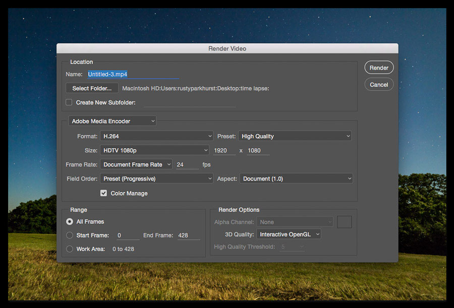 Когда у вас есть нужные фотографии, пора их экспортировать. Для этого выберите все снимки, затем перейдите в меню Файл (File) и выберите Экспорт (Export), после чего вы увидите диалоговое окно экспорта. Выберите папку, в которую будут сохранены фотографии (я обычно создаю временную на рабочем столе, чтобы не искать снимки где-попало), размер и формат. Я советую экспортировать в формате JPEG среднего размера. Как вы позже увидите, важно, чтобы имена файлов были последовательными. Здесь ваше участие может не понадобиться, поскольку камеры обычно задают такие имена по умолчанию. Однако, если последовательность каким-либо образом нарушилась, исправьте это во время экспорта. Что-то на подобие “timelapse_001”, “timelapse_002” и т.д. отлично сработает. Если необходимо, можете изменить имена файлов в соответствующей секции.