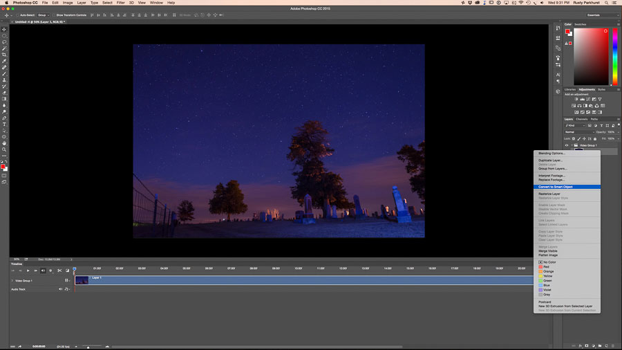 Вы могли заметить, что, если кликнуть правой кнопкой мыши по видео на шкале времени, можно изменить его длительность и скорость. Нам нужно, чтобы вместо этих настроек появилась секция Движение (Motion). Для работы с движением требуется сначала превратить нашу последовательность в смарт-объект. Кликните правой кнопкой мыши по видео-слою, затем выберите Преобразовать в Смарт-объект (Convert to Smart Object). После этого произойдет две вещи. Во-первых, иконка на миниатюре слоя изменится на значок смарт-слоя. Во-вторых, цвет клипа на шкале времени станет фиолетовым.