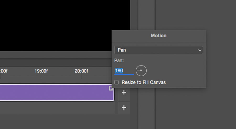Теперь в выпадающем окне, которое появляется при клике правой кнопкой мыши на клипе, будет нужный нам инструмент. Обратите внимание, что там есть несколько вариантов, включая Панорамирование (Pan), Масштабирование (Zoom), Поворот (Rotate) и комбинации этих трех. Я выбрал Панорамирование, затем установил угол 180°, чтобы камера перемещалась слева направо.