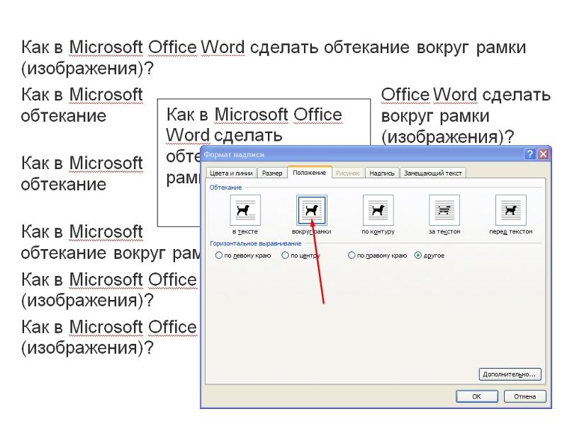 В документе текстового процессора Microsoft Office Word поместить текст справа от картинки можно при помощи изменения свойств в формате ее изображения. Для этого кликните правой кнопкой мыши по изображению. Теперь выберите пункт «Формат рисунка…». После чего откроется диалог с таким же названием. Переключитесь на пункт «Положение». Нажмите мышкой по квадрату, который изображает схему для выравнивания и под ним написано «Вокруг рамки». Выберите опцию с названием «По левому краю».