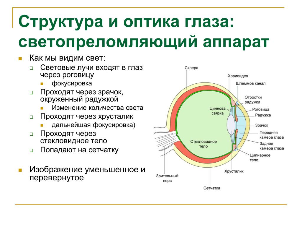Человеческий глаз нередко сравнивают с фотоаппаратом. Роговица, прозрачная и выпуклая часть наружной оболочки, подобна линзе объектива. Вторая оболочка — сосудистая — спереди представлена радужкой, содержание пигмента в которой определяет цвет глаз. Отверстие в центре радужки — зрачок — суживаясь при ярком и расширяясь при тусклом освещении, регулирует количество света, поступающего внутрь глаза, подобно диафрагме. Вторая линза — подвижный и гибкий хрусталик окружен ресничной мышцей, которая изменяет степень его кривизны. Позади хрусталика расположено стекловидное тело — прозрачное студенистое вещество, которое поддерживает упругость и шаровидную форму глазного яблока. Лучи света, проходя сквозь внутриглазные структуры, падают на сетчатку — тончайшую оболочку из нервной ткани, выстилающую глаз изнутри. Фоторецепторы — светочувствительные клетки сетчатки, подобно фотопленке фиксируют изображение.