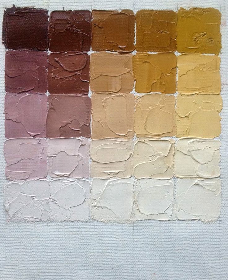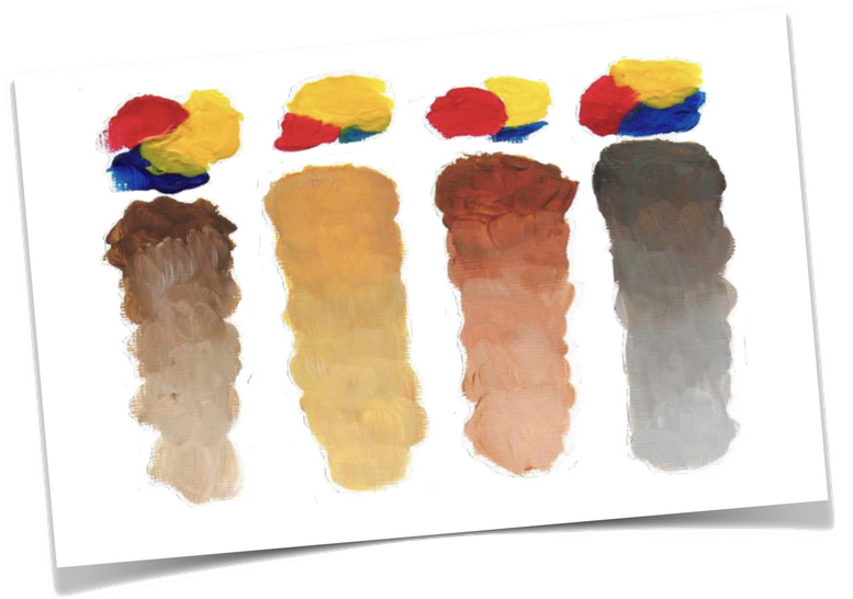 Как мы видим, для получения более теплого оттенка, должны преобладать такие цвета как красный, коричневый, желтый, охра, для холодного чаще всего используется синий.