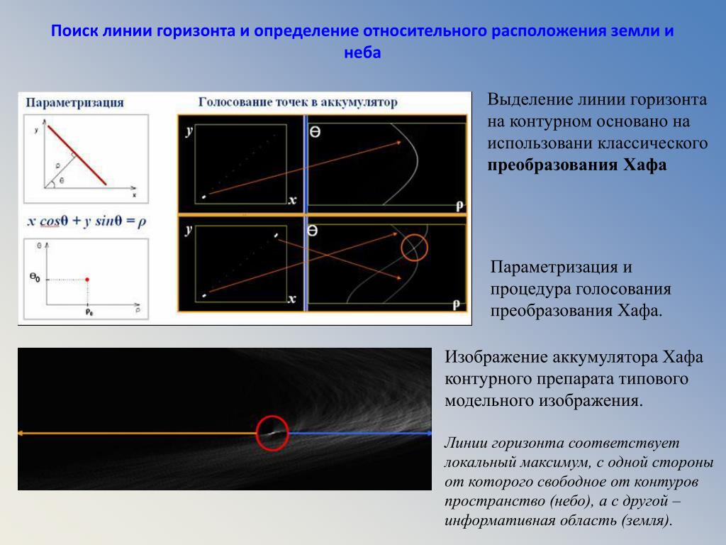 Гауссова сфера имеет аккумуляторные ячейки, которые увеличиваются, когда через них проходит большой круг, т.е. на изображении отрезок прямой пересекает точку схода. С тех пор было сделано несколько модификаций, но одним из наиболее эффективных методов было использование преобразования Хафа , отображающего параметры отрезка прямой в ограниченное пространство. Каскадные преобразования Хафа были применены для нескольких точек схода.