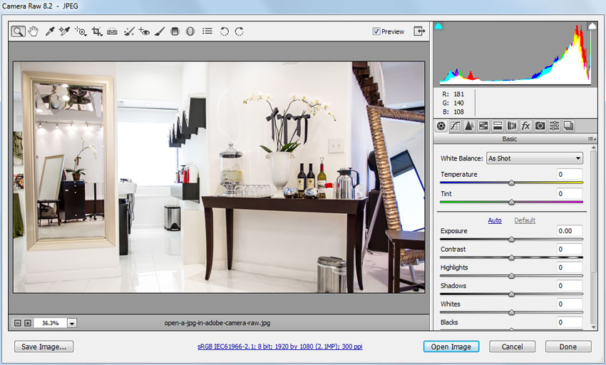 Необработанный файл теперь открыт в диалоговом окне Camera Raw.