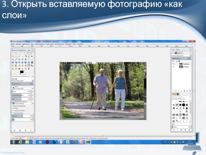 Слои в многослойном изображении можно легко представить, как стопку прозрачных слайдов, расположенных один над другим, на которые вы смотрите сверху. Элементы изображения на нижних слоях могут быть «заслонены» элементами, что содержатся в верхних слоях этой стопки, если этот элемент находится в соответствующей области. Для получения более детальной информации о работе со слоями, перейдите в раздел Работа со слоями.